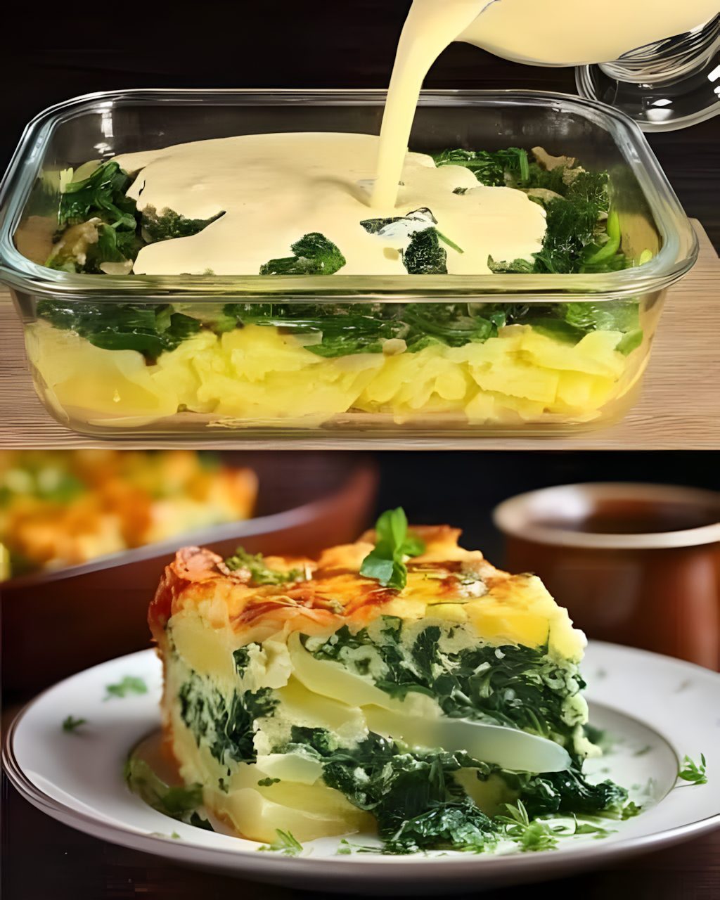 heerlijke Aardappel-Spinazie Gratin 🥔🥬 met een romige saus en een knapperige kaaslaag! Hier is het recept, zodat je het zelf kunt maken!