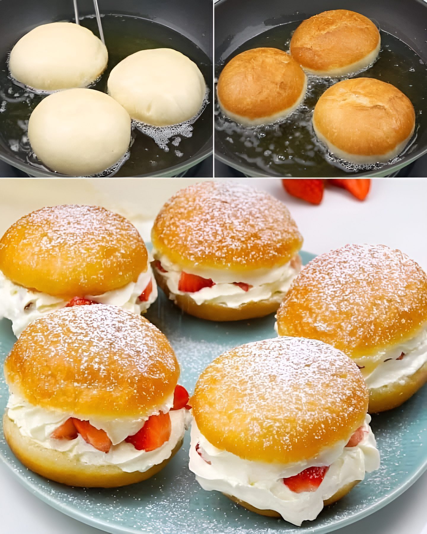 Deze heerlijke aardbeibommen zijn perfect voor een zoete traktatie. De zachte, luchtige balletjes gevuld met slagroom en aardbeien maken van elke hap een feestje!