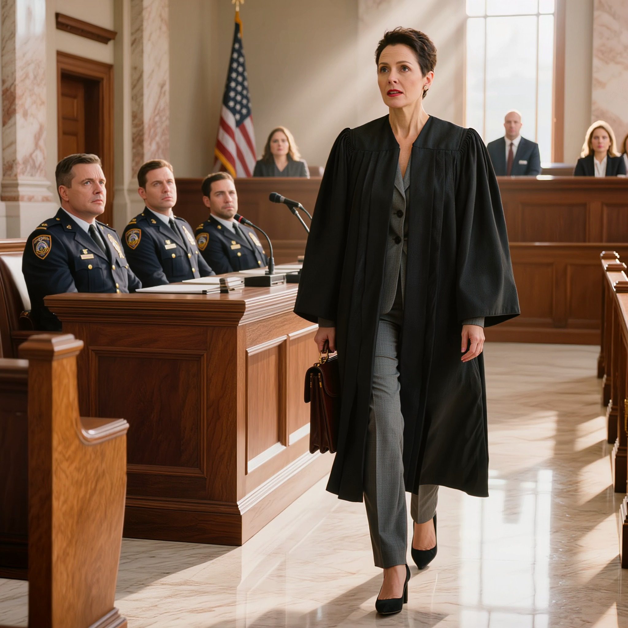 De ochtendzon wierp lange schaduwen over de slaapkamer van rechter Claudia Hayes terwijl ze voor de spiegel stond en met geoefende precisie haar zijden blouse recht trok. Vandaag was niet zomaar een dag in de rechtbank. Het was de bekroning van maandenlange voorbereiding op een cruciale hoorzitting over wangedrag van de politie. Haar vingers volgden de gladde stof, elke beweging weloverwogen en afgemeten. Ze had gekozen voor een antracietgrijs broekpak dat respect afdwong, ook zonder haar toga. De verantwoordelijkheid drukte zwaar op haar schouders toen ze haar aktetas pakte en twee keer controleerde of alle essentiële documenten erin zaten. Haar badge, veilig opgeborgen in het leren etui, vertegenwoordigde niet alleen gezag, maar ook een twintigjarige reis door een systeem dat haar aanwezigheid niet altijd had verwelkomd.
