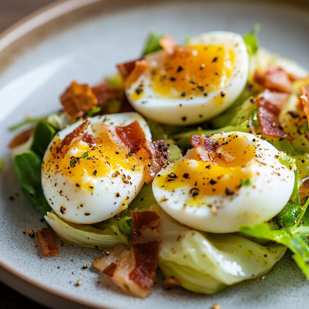 Warme salade van gebakken witlof, spek en zachtgekookt ei