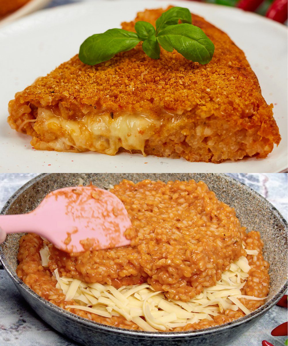 Ingrediënten: 250 g (1 kop) arboriorijst 300 ml (1 ¼ kop) tomatensaus 15 g (1 eetlepel) tomatenpuree ½ ui, fijngesneden 500 ml (2 koppen) groentebouillon 100 g (½ kop) pittige geraspte kaas 200 g (1 kop) geraspte kaas 1 theelepel Italiaanse kruidenmix Paneermeel Olijfolie Zout en peper naar smaak Bereidingswijze: