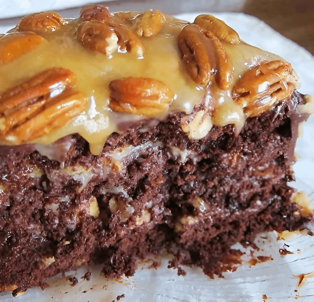 Ingrediënten: Voor de cake: 1 (18-ounce) doos Duitse chocoladecakemix 1 1/3 kopjes water (of zoals aangegeven op de cakemixverpakking) 1/3 kopje olie (of zoals aangegeven op de cakemixverpakking) 3 eieren (of zoals aangegeven op de cakemixverpakking) Voor de karamelvulling: