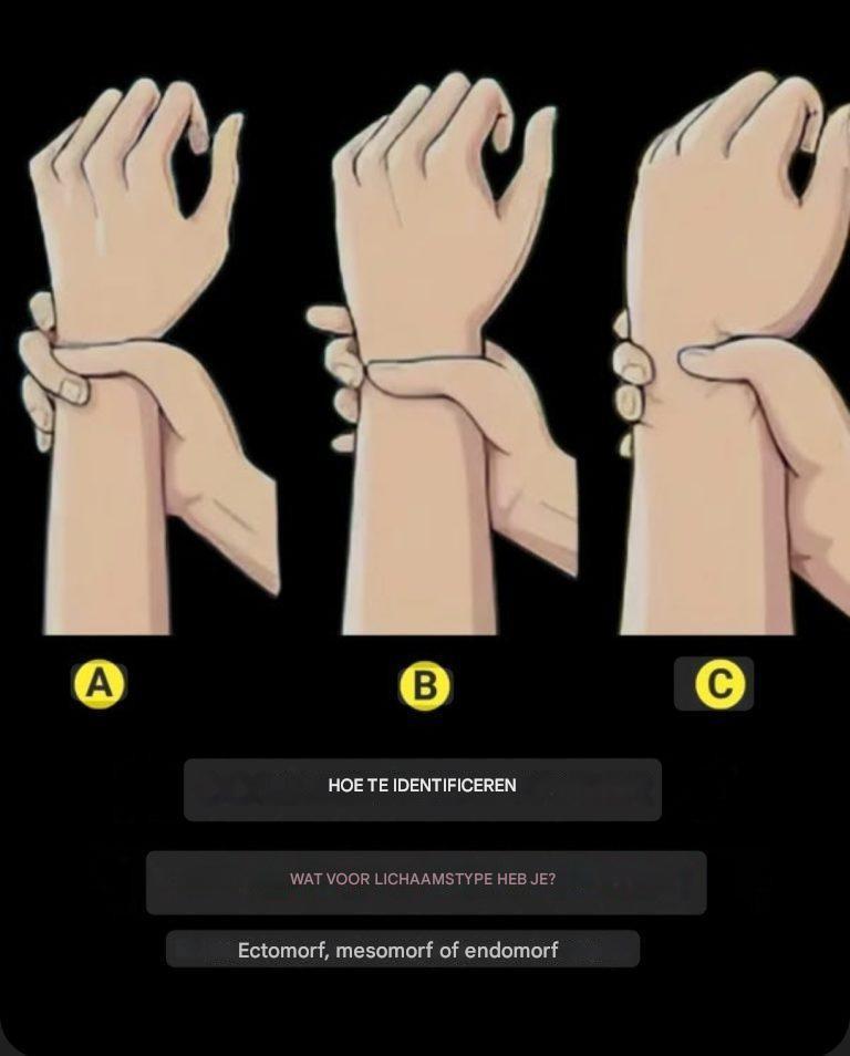 HOE HERKEN JE JE LICHAAMSTYPE? De test die in de afbeelding wordt getoond, stelt je in staat je lichaamstype te bepalen door de omtrek van je pols te meten ten opzichte van de grootte van je hand. De drie belangrijkste lichaamstypes zijn ectomorf, mesomorf en endomorf. A – Ectomorf: De duim en middelvinger overlappen elkaar … Lire plus