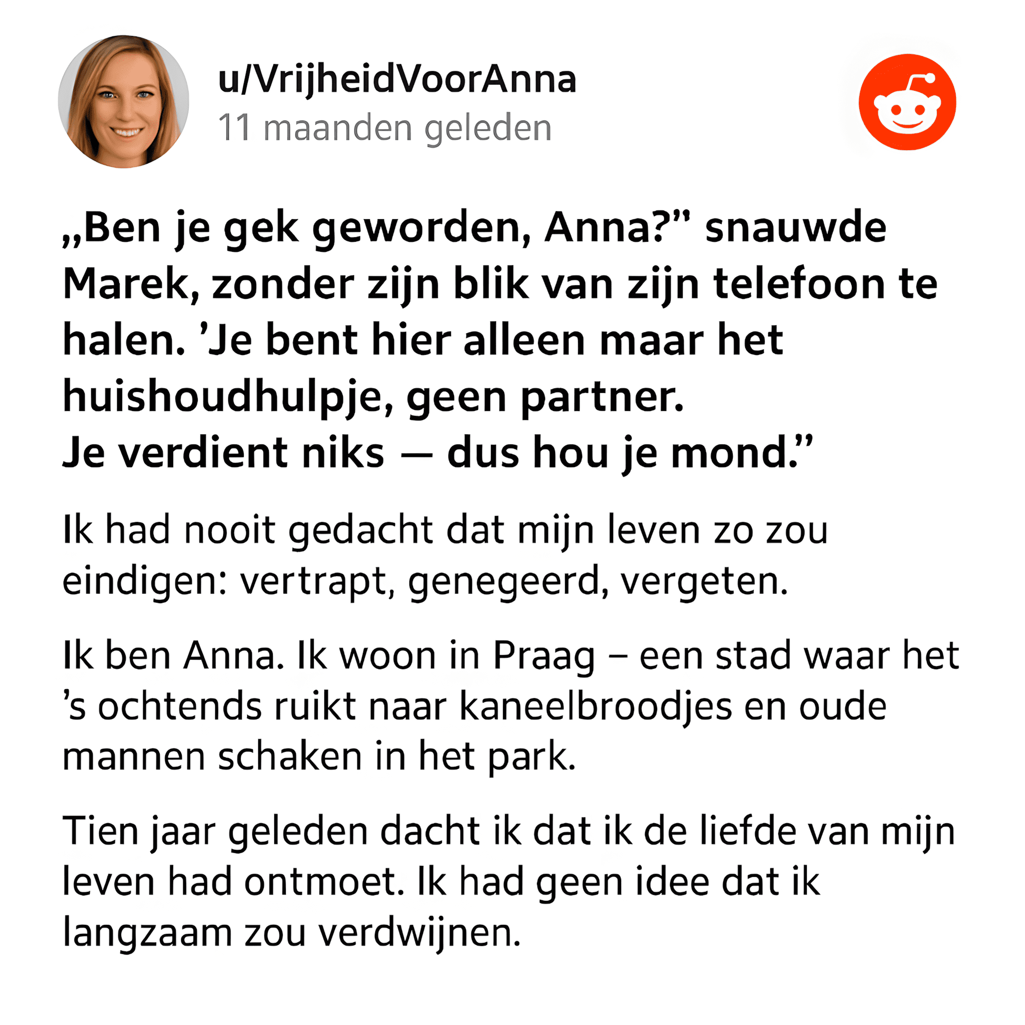 Ik ben Anna. Ik woon in Praag — een stad waar het ’s ochtends ruikt naar kaneelbroodjes van de bakker om de hoek en waar ’s avonds oude mensen schaken in het park. Iedereen kent elkaar. Dat maakt mijn pijn alleen maar zichtbaarder.