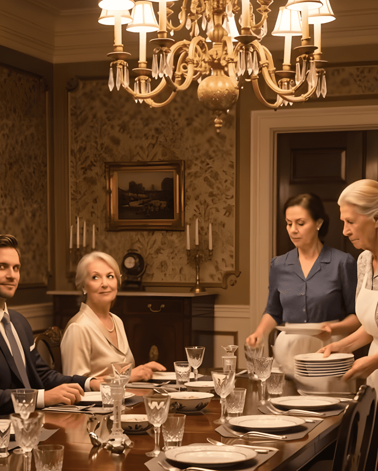 Ze zou erachter staan, glazen bijvullen en borden opruimen terwijl iedereen deed alsof ze onzichtbaar was.