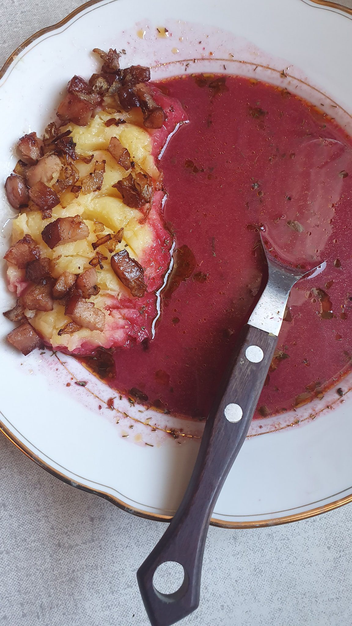 Borsjt Met Rode Biet, Aardappelen en Gebakken Spek – Een Traditionele Poolse Klassieker! 🥔❤️