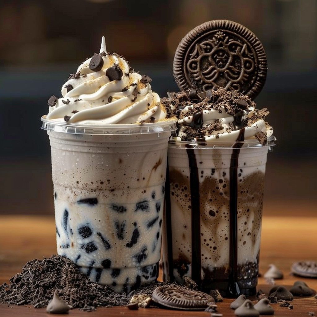 Koekjes & Crème Frappuccino Ingrediënten: 2 kopjes ijsblokjes 1 kopje melk 2 eetlepels suiker gekristalliseerd 1/2 theelepel extract van vanille 8 koekjes Oreo 2 eetlepels siroop chocolade Slagroom, ter garnering Oreokoekjes extra voor garnering Lees meer op de volgende pagina