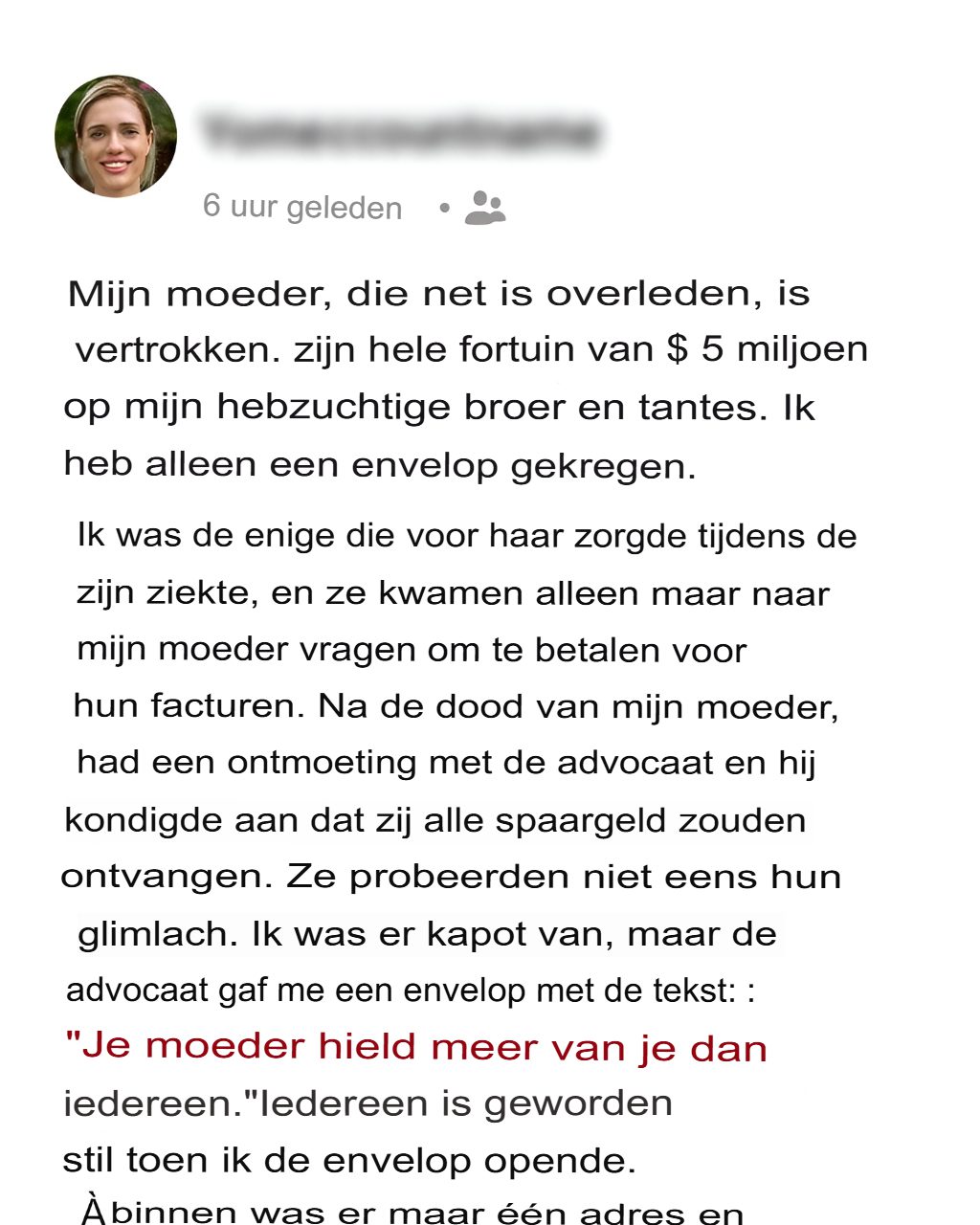 « Mijn Overleden Moeder Liet Een Erfenis van 5 Miljoen Dollar Achter aan Mijn Broer en Mijn Hebzuchtige Tantes, en Ik Ontving Alleen Een Envelop Met Een Adres… 📜🏠 »