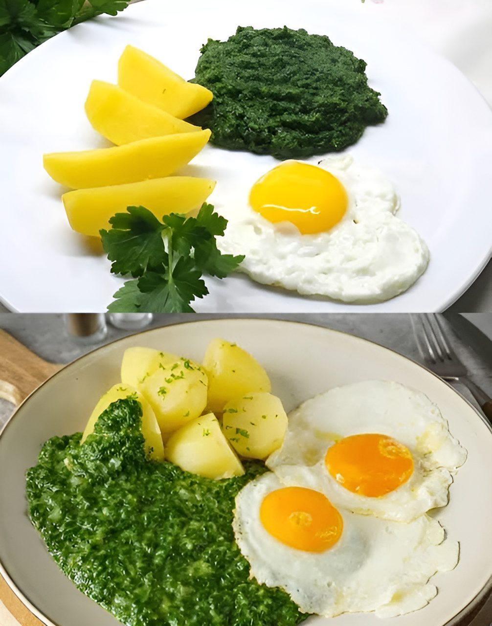 Spinazie, gebakken ei en gekookte aardappelen