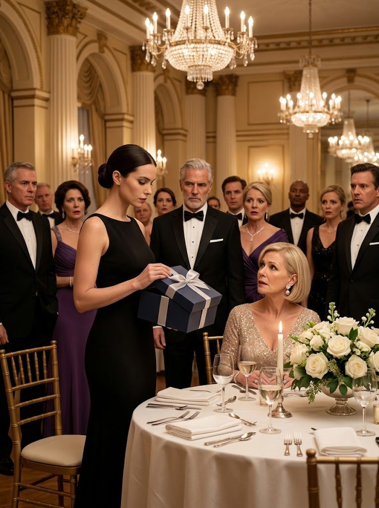 Ik verplaatste de doos in mijn armen en keek haar aan – echt aan. Linda Thornton, met zilveren sieraden en een crèmekleurige zijden jurk, stond in het balzaallicht, haar haar professioneel gekruld en haar mond gevormd als de ultieme zekerheid van een vrouw die ervan overtuigd was dat ze de zaal nog steeds beheerste.