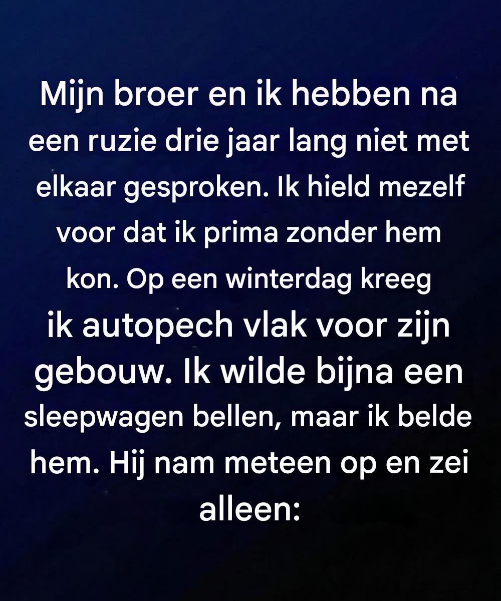 Geen aarzeling. Geen verwarring. Alleen mijn naam, uitgesproken zoals hij dat altijd deed – vertrouwd, ongedwongen. Even kon ik niet spreken. Toen ik eindelijk uitlegde waar ik was, klonk mijn stem dunner dan normaal. Er viel een korte stilte, lang genoeg om oude angsten weer op te rakelen. Toen zei hij simpelweg: ‘Blijf staan. Ik blijf hier.’