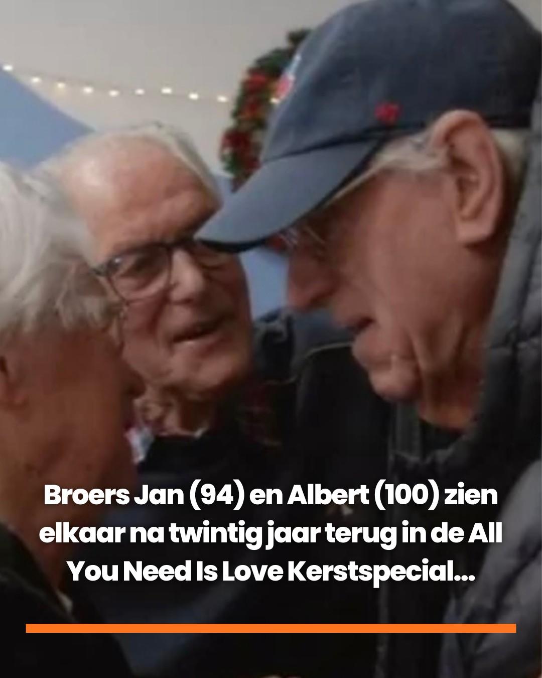 Ze samengeteld meer dan 190 jaar oud, al twintig jaar gescheiden, en toch komt het moment daar. In de All You Need Is Love Kerstspecial zorgt presentator Robert ten Brink voor een hereniging die niemand onberoerd laat. Broers Jan (94) en Albert (100) vallen elkaar eindelijk weer in de armen.