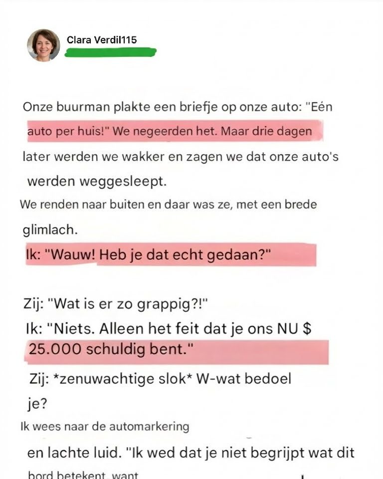 « Welkom in de buurt! » tweette ze. « Ik wilde je even afzetten… en, ja, nog even een korte herinnering: onze Vereniging van Eigenaren (VvE) staat maar één auto per oprit toe. Strikte regels. Geen uitzonderingen. »