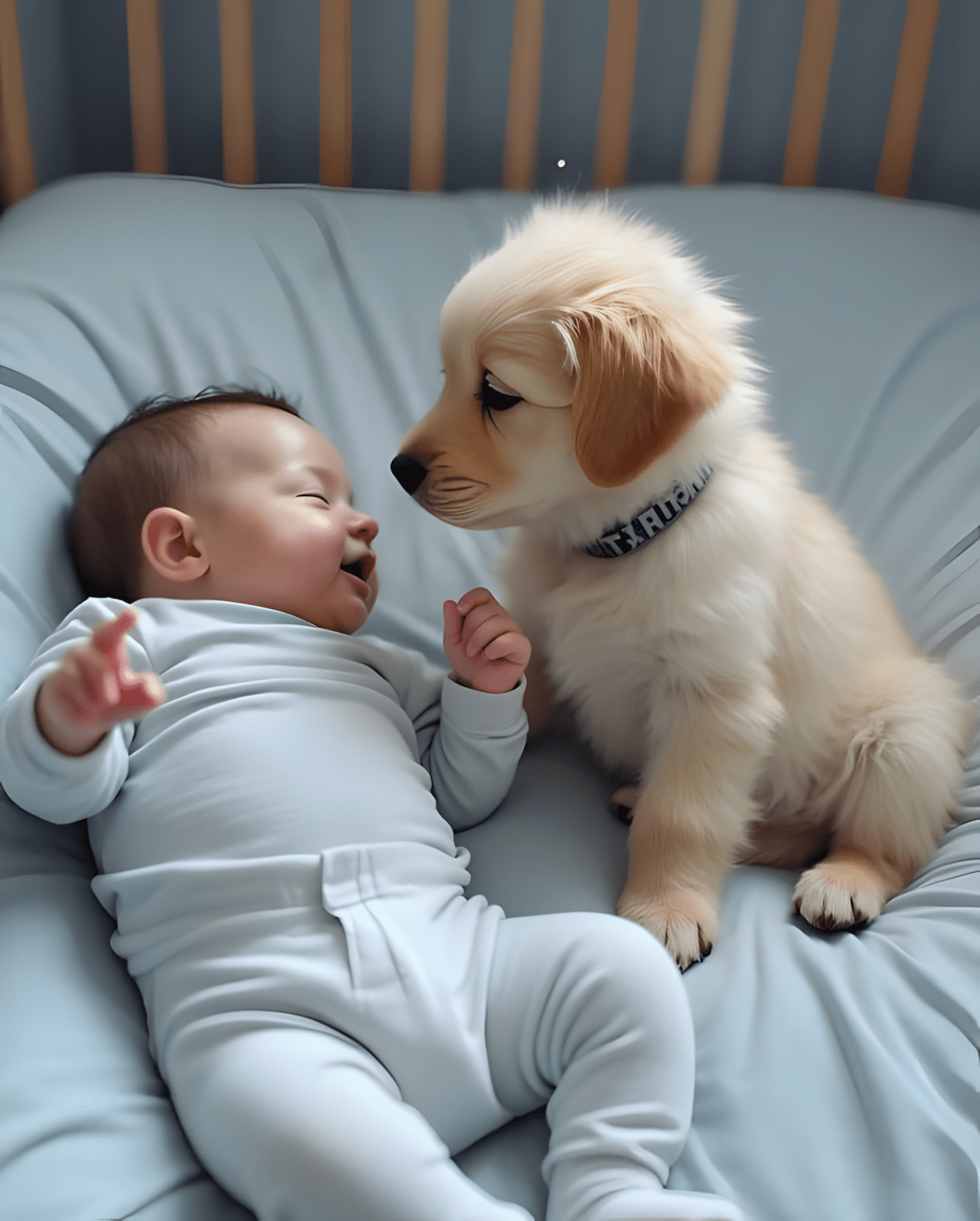 De kleine golden retriever zweeg. Hij kantelde zijn kop en keek haar aan met een bijna menselijke blik. Toen liep hij zonder aarzelen naar de kribbe.