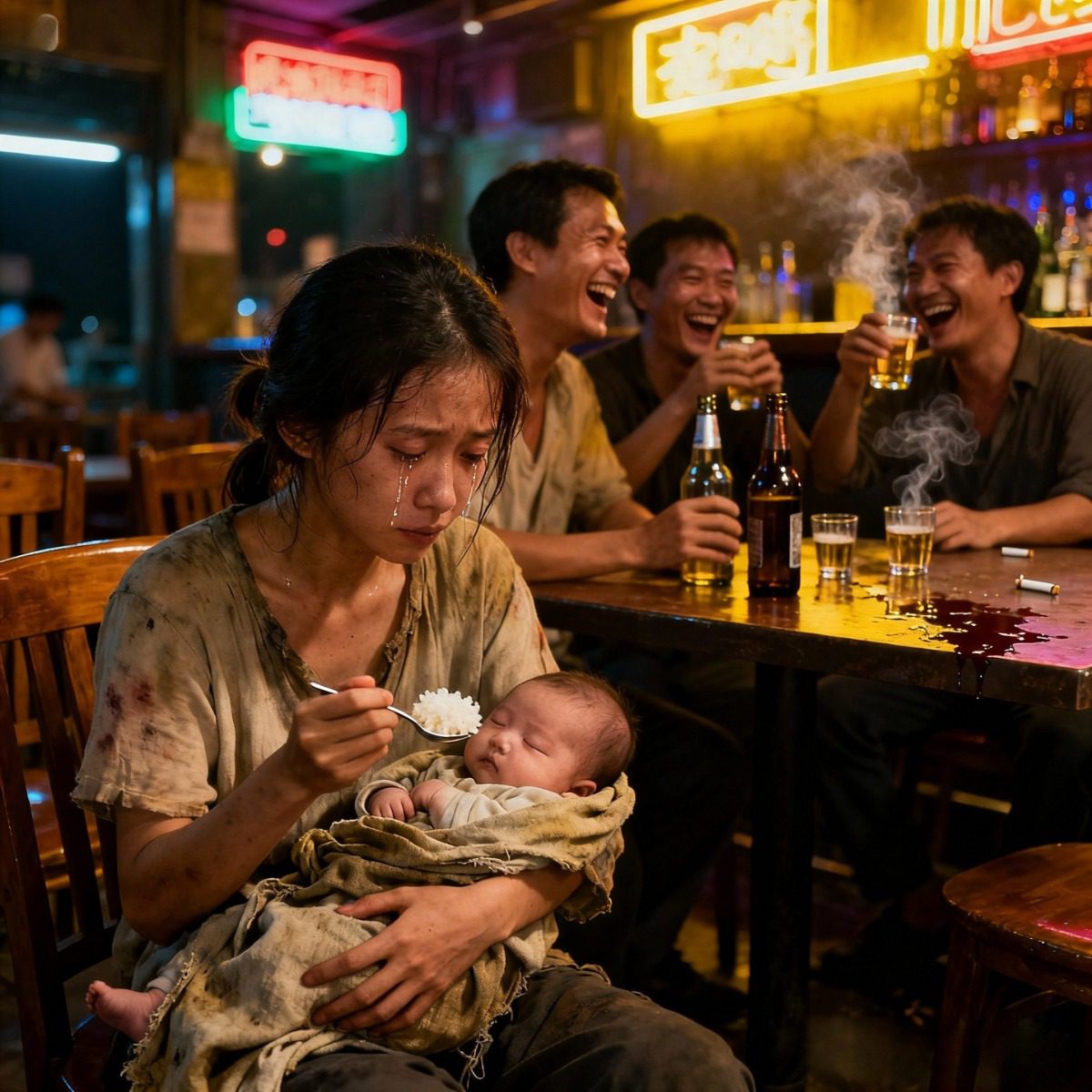Vanuit haar bed wiegde ze voorzichtig haar pasgeboren baby, terwijl het schallende gelach van een aantal mannen als hamerslagen op haar hoofd door de kamer galmde.