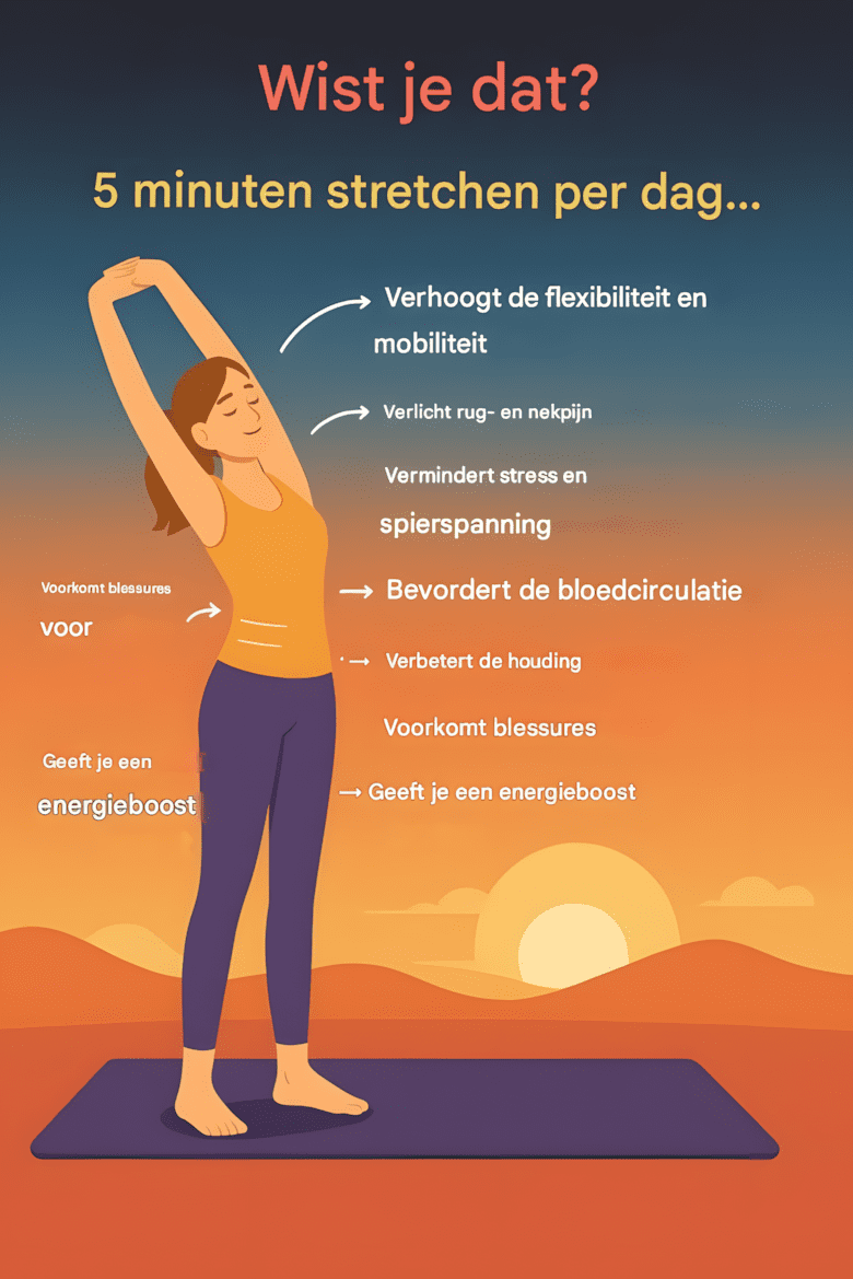We denken vaak dat fitness uren trainen in de sportschool, ingewikkelde routines of dure apparatuur vereist. Maar wat als ik je vertelde dat  slechts vijf minuten per dag  je lichaam kan transformeren? Stretchen is een van de eenvoudigste en meest effectieve gewoonten die je in je dagelijkse routine kunt opnemen – en de resultaten zullen je verbazen.