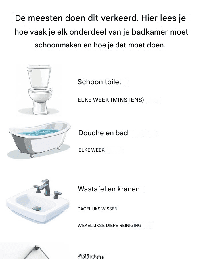 Douches en badkuipen moeten wekelijks worden schoongemaakt om zeepresten en schimmelvorming te voorkomen. Gebruik een niet-schurende reiniger en een schrobborstel om tegels en voegen aan te pakken. Voor glazen deuren kan een mengsel van azijn en water helpen bij het verwijderen van watervlekken. Spoel oppervlakken grondig af en droog ze af om watervlekken en schimmelgroei te voorkomen.
