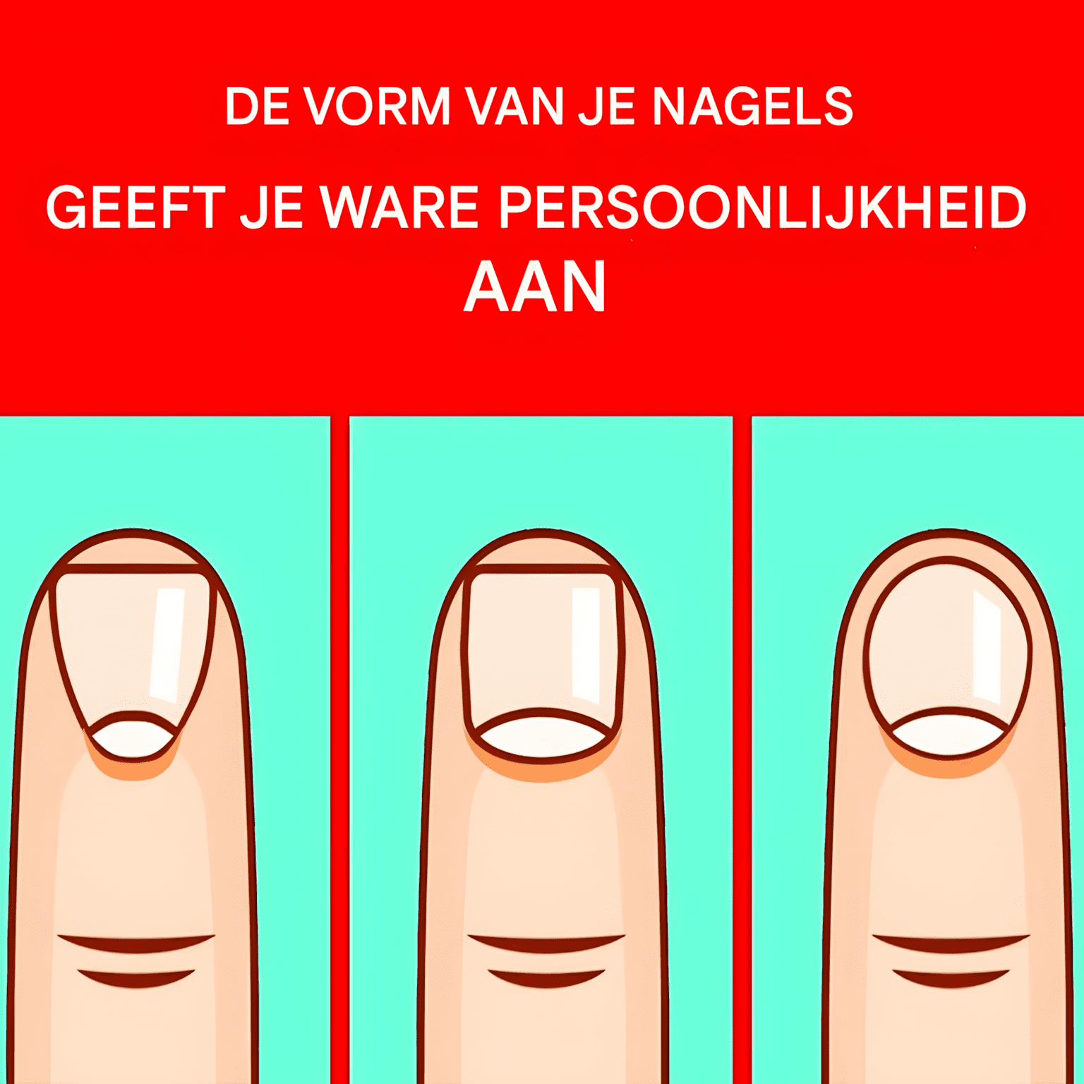 Uw handen en de conditie van uw nagels kunnen veel informatie geven over uw levensstijl, de tijd die u besteedt aan de verzorging van uzelf en ook over uw persoonlijkheid. Als de manier waarop u uw nagels knipt u misschien onbelangrijk lijkt, weet dan dat het niet waar is. Hun vorm kan namelijk veel geheimen onthullen. Ontdek met deze test welke karaktereigenschappen jij hebt op basis van de vorm van je nagels.Vindt u het leuk om naar de schoonheidsspecialiste te gaan voor een manicure? Of verwaarloos je ze juist en denk je dat het onopgemerkt zal blijven? U zult zeker van gedachten veranderen zodra u ontdekt welke geheimen zij voor u hebben. De vorm van uw nagels kan inderdaad verschillende aspecten van uw persoonlijkheid onthullen. Bent u meer een onafhankelijk persoon? bepaald? Ben jij een leider of een volger? Ontdek het met deze test.Je hebt lange nagels