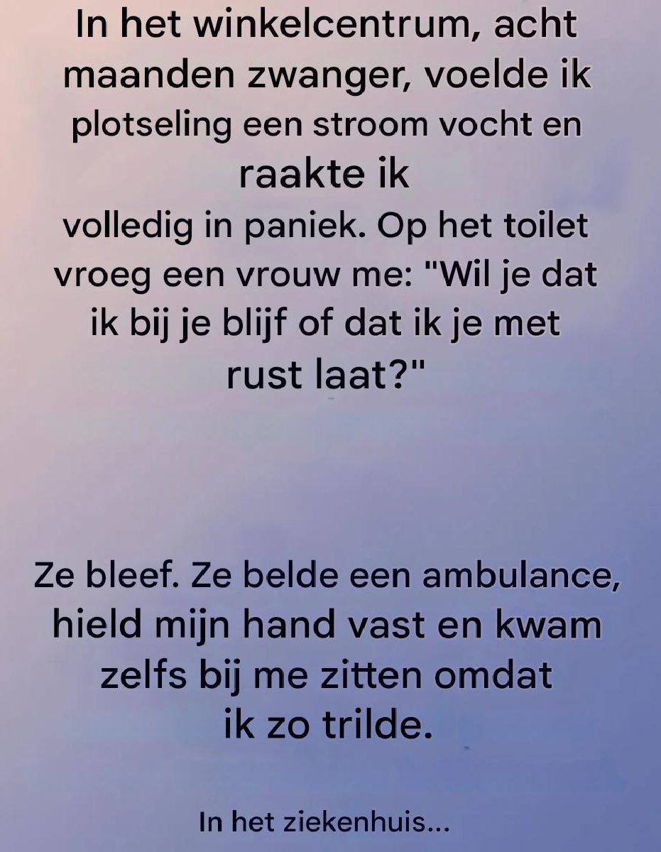 Ik was zwanger en al een beetje moe die dag. Ik liep in het winkelcentrum, een tas in de ene hand, mijn telefoon in de andere, toen een plotselinge pijn me de adem benam.