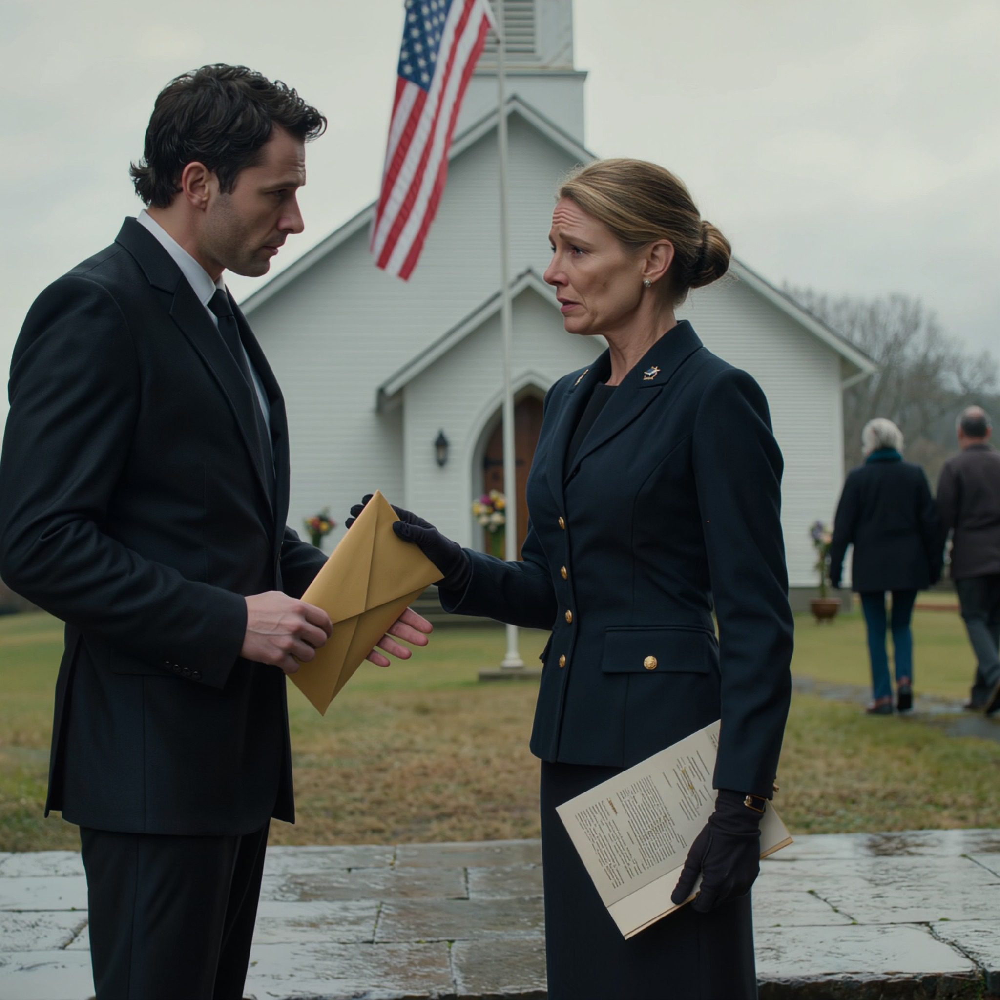 Direct nadat de begrafenis van mijn man was afgelopen en de laatste gasten de kerk verlieten, kwam zijn assistent plotseling naar me toe. Hij keek even rond en schoof toen stilletjes een verzegelde gele envelop in mijn hand. Op de voorkant stond alleen mijn naam, geschreven in het handschrift van mijn man. Hij verlaagde zijn stem, voorzichtig en gespannen. ‘Maak hem hier niet open. En luister goed. Vertel het aan niemand in je familie.’