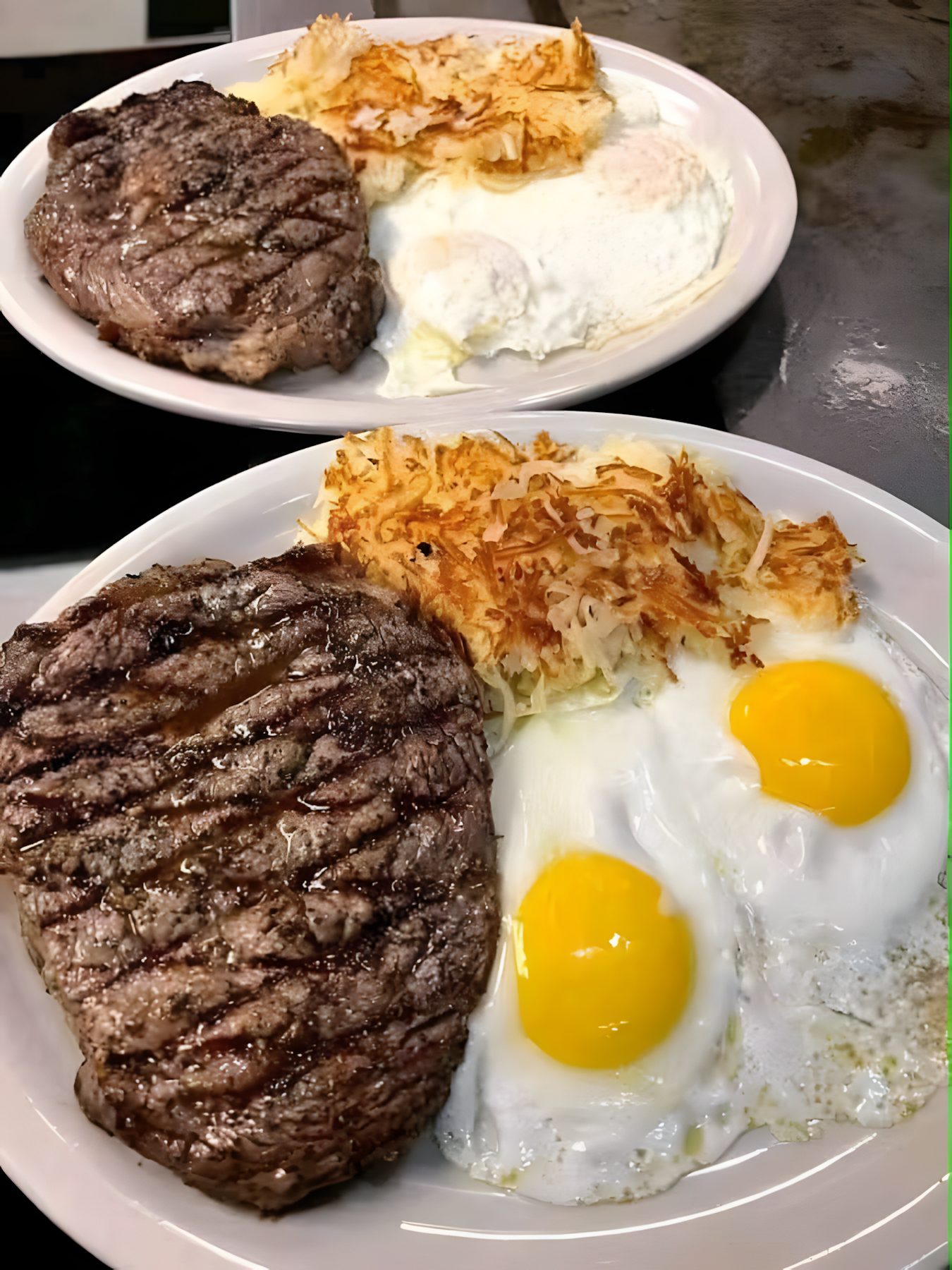 Dit is een stevig en eiwitrijk ontbijt dat vaak geserveerd wordt in dinerrestaurants en steakhouses. Het is niet alleen een klassiek Amerikaans ontbijt, maar ook perfect als een voedzame brunch of post-workout maaltijd! 💪