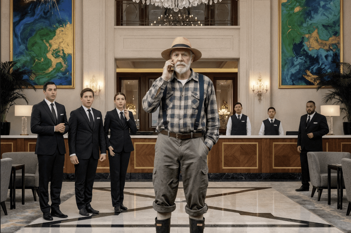 De jonge receptioniste, met haar felrode lippenstift, bekeek hem van top tot teen en fronste. In haar ogen was een vijfsterrenhotel alleen voor elegante en ‘succesvolle’ mensen, niet voor boeren in vuile kleren. Ze schraapte haar keel en zei koud: