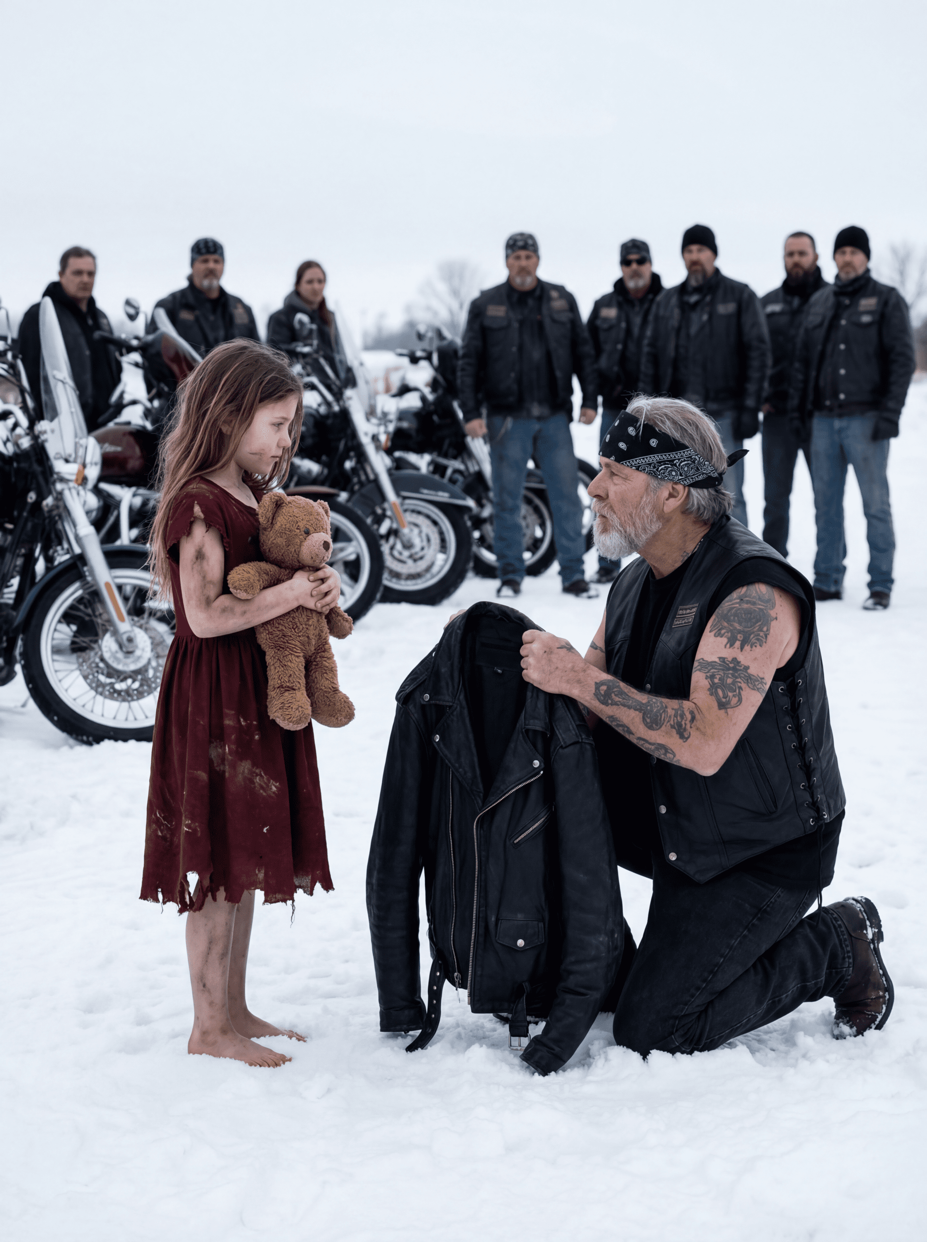 Ze was zeven, zo mager als een jonge boom, gehuld in een zomerjurk die absoluut niet geschikt was voor december. Haar sneakers waren doorweekt van de sneeuwbrij. Haar knieën waren opgetrokken tot onder haar kin. In haar handen hield ze een versleten teddybeer met een ontbrekend oog en een scheur aan de zijkant waar de vulling eruit dreigde te ontsnappen.