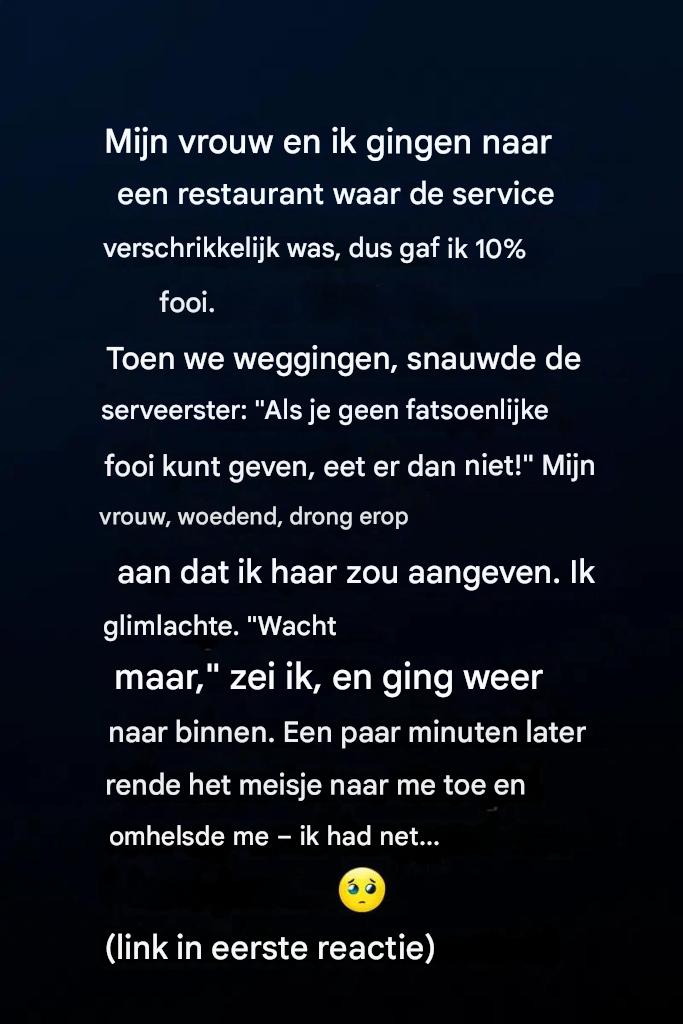 Ik gaf nog steeds 10% fooi, maar toen we weggingen, riep de serveerster ons streng na: “Iedereen die geen fatsoenlijke fooi kan geven, moet niet uit eten gaan!”