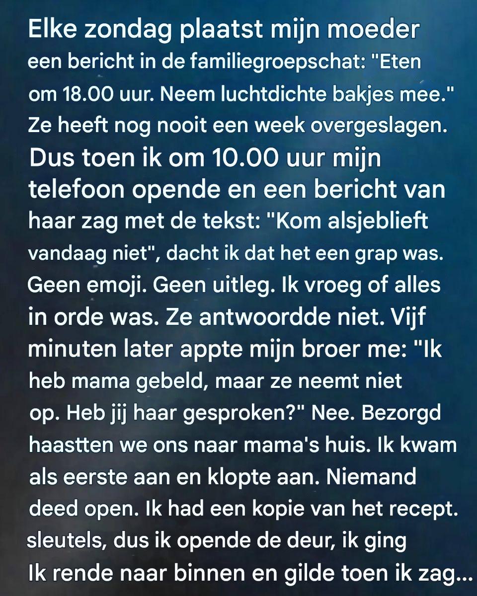 Toen dat gevreesde berichtje binnenkwam – « Kom alsjeblieft vandaag niet » – voelde ik meteen dat er iets niet klopte. Geen uitleg, geen geruststellende woorden. Gewoon dit ongebruikelijke, bijna kille verzoek. Mijn broer en ik hoefden er niet eens over te praten: we stapten gewoon in de auto.