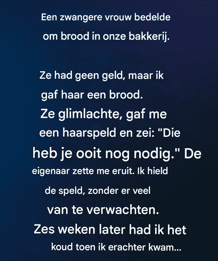 Even aarzelde ik. De eigenaresse had het duidelijk gemaakt: geen aalmoezen, geen uitzonderingen. Maar iets in haar stem – zacht, trillerig, wanhopig – gaf de doorslag. Ik pakte een vers brood in, nog warm uit de oven, en gaf het haar.