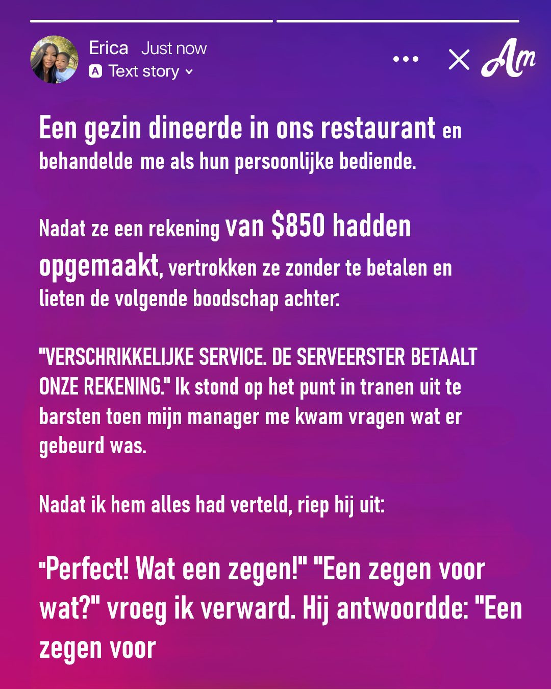 Toen een gezin hun restaurantrekening van $850 niet betaalde, was ik er kapot van. Maar dankzij het slimme plan van mijn manager en een onverwachte bondgenoot wisten we het tij te keren op een manier die ze niet hadden verwacht.