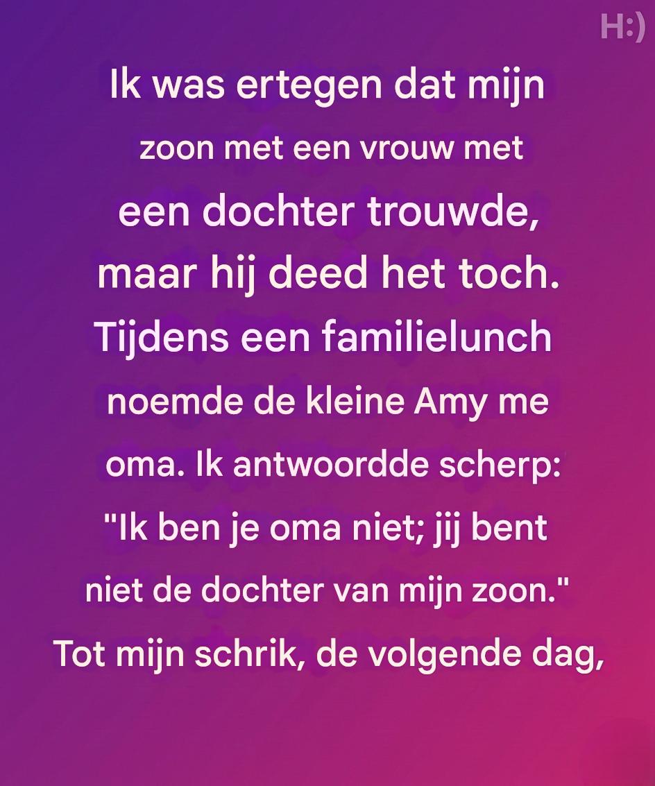 De familielunch begon zoals elke andere, met warm zonlicht dat over de tafel viel, borden die zachtjes tegen elkaar kletterden en het geroezemoes van gemoedelijke gesprekken dat de kamer vulde. Er zat een ontspannen ritme in – het soort ritme dat gewoon aanvoelt, maar tegelijkertijd troostend is, de onzichtbare lijm van het familieleven. Iedereen was ontspannen, lachte en deelde verhalen over kleine, onbeduidende dingen, maar juist deze gewone momenten dragen vaak de zwaarte van de ware betekenis van het leven. En toen, alsof het universum een klein beetje verschoof, keek de kleine Amy me aan met haar grote, vertrouwende ogen en sprak één woord uit: « Oma. » Het had een moment van pure warmte moeten zijn, een moment dat de spanning van jaren deed smelten, een moment dat me volledig en zonder voorbehoud in haar wereld uitnodigde. In plaats daarvan trok iets in me samen in een onverwachte, koude reflex. Onmiddellijk verving defensiviteit tederheid, angst verving vreugde en rees er een muur die ik onbewust tussen ons had opgetrokken. Zonder na te denken, zonder de kans om mijn emotie te filteren, flapte ik eruit: « Ik ben je oma niet. » De woorden bleven in de lucht hangen en landden als stenen die in een stilstaand wateroppervlak werden gegooid. Er viel een onmiddellijke, tastbare stilte die het geluid van bestek, het geritsel van servetten en het lichte geroezemoes overstemde. Iedereen draaide zich even om, niet uit woede maar uit schrik, alsof de hele ruimte even stilstond, opgeschort door het plotselinge, zware gewicht van mijn eigen bekentenis. Ik zag een vleugje verwarring op Amy’s gezicht, en hoewel ze niets zei, sprak haar uitdrukking boekdelen: een eenvoudig gebaar van liefde van een kind werd afgewezen. Die lunchtafel, ooit een plek van alledaags comfort, was in een oogwenk veranderd in een stil slagveld waar angst en liefde botsten, en ik besefte pijnlijk dat ik was gestuit op mijn eigen onvermogen om verandering te accepteren, om genegenheid toe te laten in mijn afgeschermde hart.