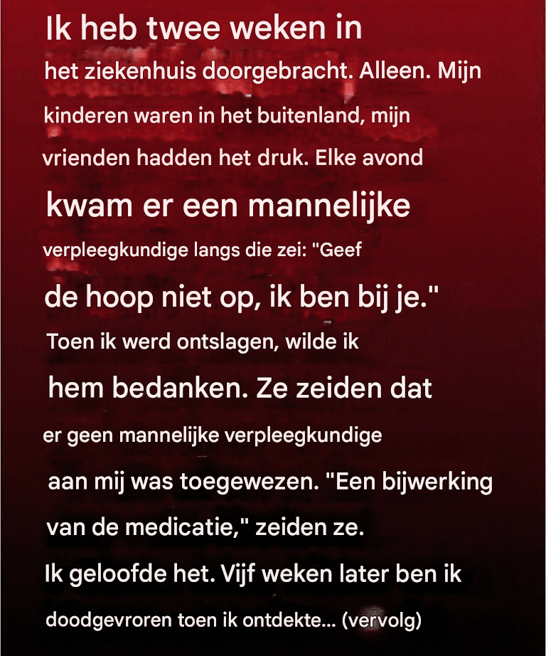 Gedurende de twee weken die ik in het ziekenhuis doorbracht, leek de tijd zijn vorm te verliezen. Ochtenden gingen over in middagen, middagen in lange, onrustige nachten. De kamer was altijd gevuld met geluid, maar tegelijkertijd vreemd leeg – het constante piepen van monitors, het zachte gesis van zuurstof, het verre gekletter van karretjes over de gepolijste vloer. Maar geen bekende stemmen klonken door de deur. Mijn kinderen woonden in verschillende steden en probeerden hun carrière en gezin te combineren. Vrienden stuurden beleefde berichtjes, maar kwamen zelden op bezoek. De bezoekuren kwamen en gingen als een vloedgolf die de kust nooit helemaal bereikte.
