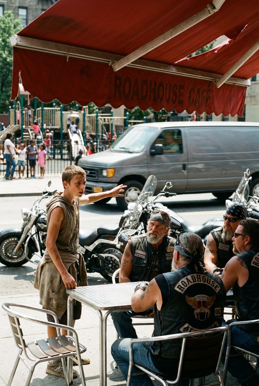 Zijn hart bonkte in zijn keel toen hij de straat overstak, zich ervan bewust dat deze keuze iets zou veranderen, of het nu zou lukken of niet. Toen hij hun tafel naderde, verstomde het gelach op een manier die minder op vijandigheid leek en meer op een verscherpte aandacht. Ogen sloegen op, lichamen verstijfden, en aan het hoofd van de groep zat Marcus « Grave » Holt, een man wiens zilvergrijze baard en kalme houding de indruk wekten van iets ouds en onbeweeglijks, als een berg die geduld had geleerd in plaats van agressie.