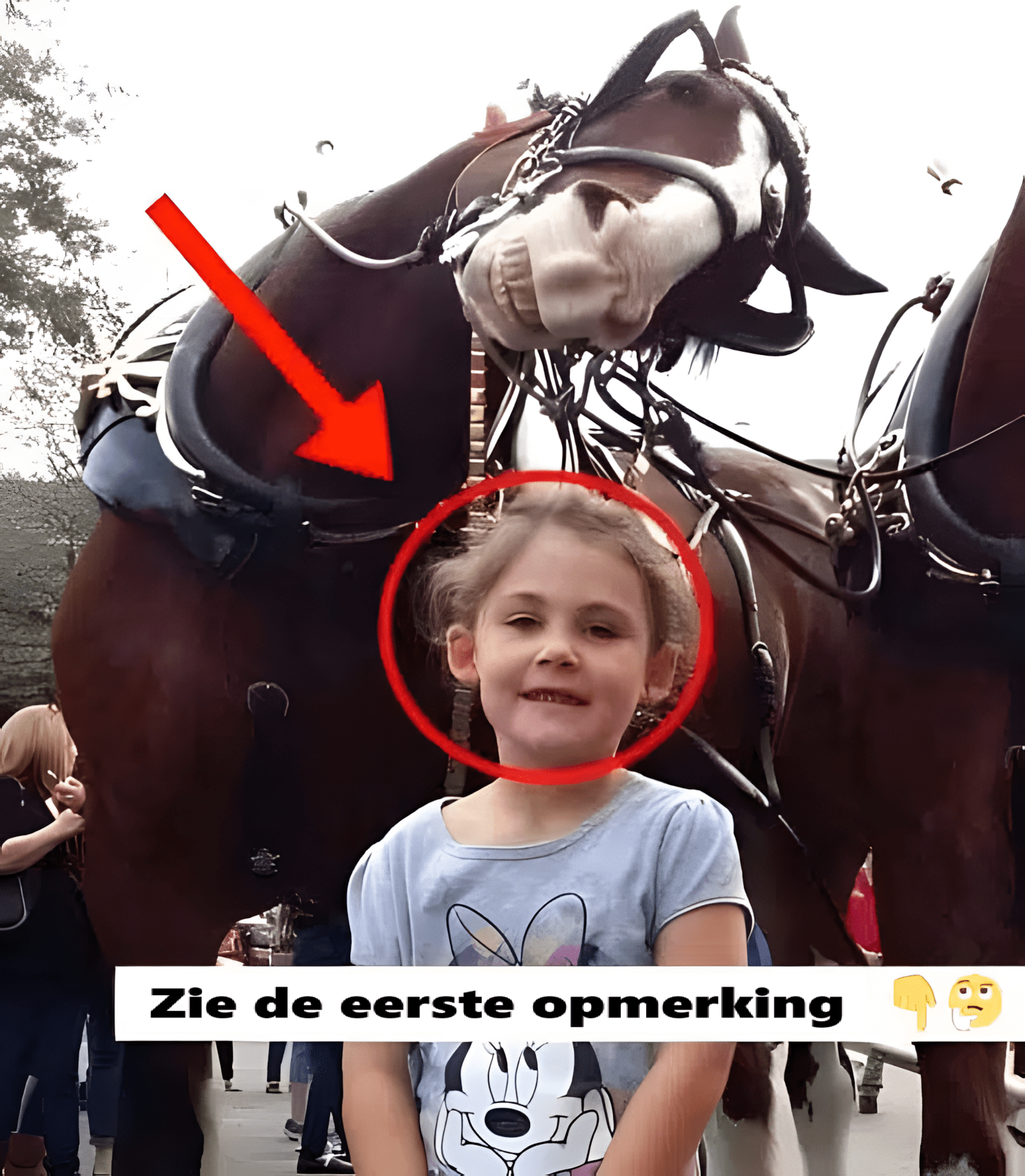 Terwijl de camera het moment vastlegt, besluit een paard dat vlak achter het meisje staat, de hoofdrol te spelen. Met perfecte timing toont hij een ondeugende, bijna menselijke uitdrukking , wat de foto een tegelijk hilarisch en schattig tintje geeft. Het contrast tussen de onschuld van het kind en de ondeugende uitdrukking van het dier maakt het beeld onweerstaanbaar.