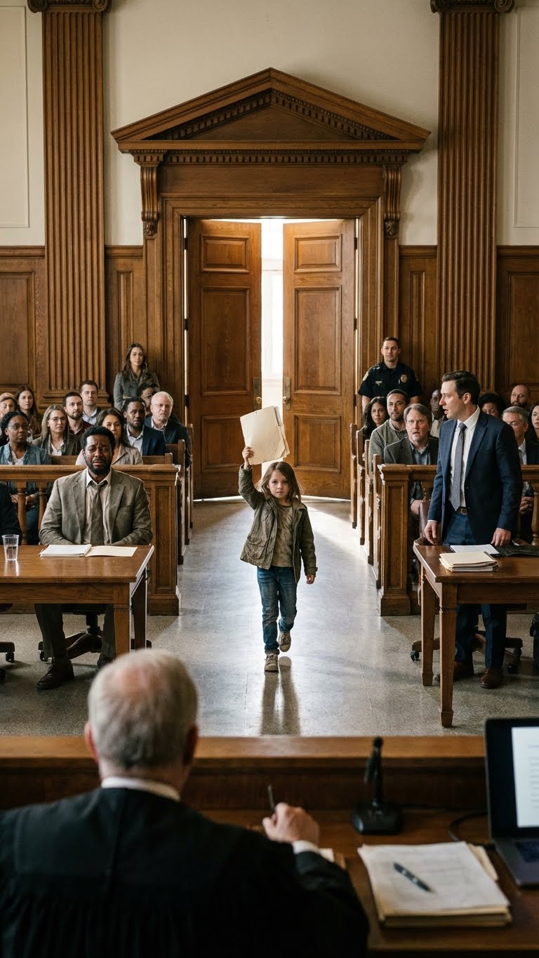 Een vader werd in de rechtbank ten onrechte beschuldigd van fraude. Net toen de officier van justitie een gevangenisstraf van vijftien jaar eiste, stormde zijn zevenjarige dochter de rechtszaal binnen. Ze riep: « Laat mijn vader vrij… en ik laat u vrij. » Ze hield een geheime map omhoog die alles veranderde.