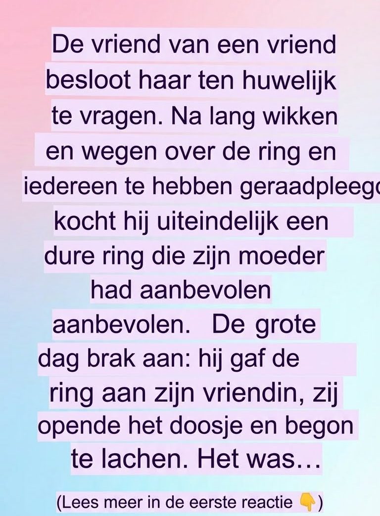 Het was niet… de reactie die hij na weken van voorbereiding en onderdrukte opwinding had verwacht. Hij had zich verrassing voorgesteld, misschien tranen van vreugde, of zelfs een verbijsterde stilte – maar lachen was het laatste waar hij aan dacht. Toen ze haar hand naar haar mond bracht en probeerde de lach die naar haar lippen opsteeg te onderdrukken, voelde hij verwarring en bezorgdheid opkomen. Maar ze pakte bijna onmiddellijk zijn hand vast en vroeg hem vriendelijk om bij haar te komen zitten voordat hij zich zorgen kon maken. Er was iets teder in haar blik – teder genoeg om het moment te verzachten, ook al leek alles in rep en roer.