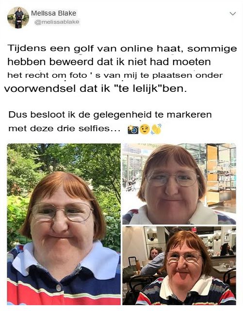 Maar in plaats van zich erdoor te laten ontmoedigen, besloot Melissa om moedig te reageren. Op Twitter plaatste ze drie selfies met daarbij een ironische boodschap: