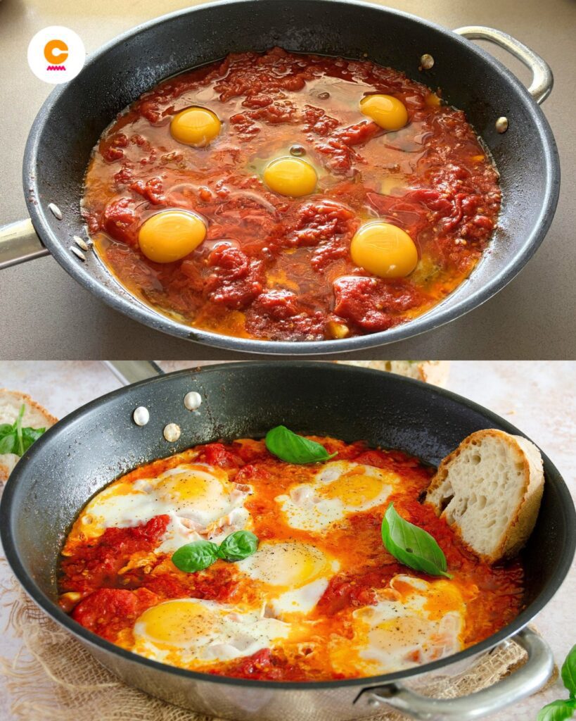 geschilde tomaten, 5 eieren, 1 teentje knoflook , extra vierge olijfolie naar smaak, verse basilicum naar smaak, zout naar smaak , peper naar smaak. Eieren in het vagevuur zijn een van de vele manieren om eieren te bereiden. Het is een heerlijk alternatief voor roerei, hardgekookte eieren en gebakken eieren, maar ook voor frittata’s en omeletten: hier wordt het ei gekookt in een geurige tomatensaus, waardoor het een perfect bijgerecht is voor een last-minute diner of wanneer je geen zin hebt om te koken.