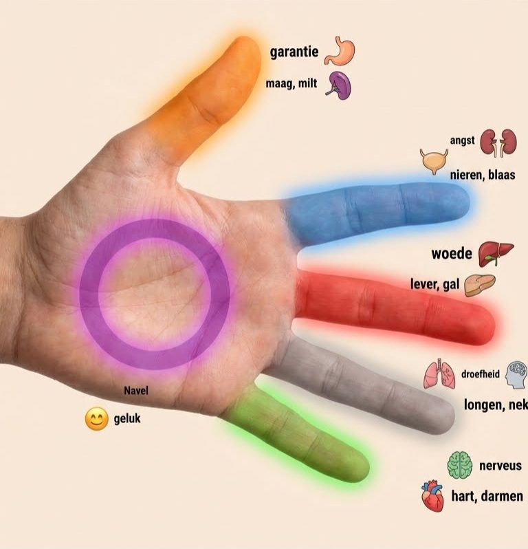 Het basisidee achter deze filosofie is dat elke vinger verbonden is met een specifiek orgaan en een specifieke emotie. Als u ervoor kiest om een specifiek orgaan te behandelen, druk dan 3 tot 5 minuten op het corresponderende punt op uw hand en probeer te ontspannen.