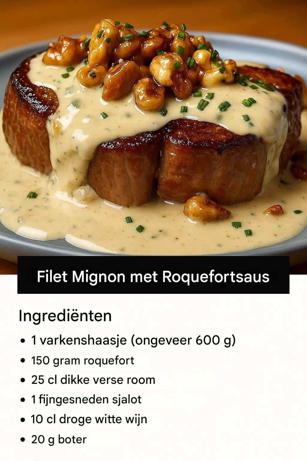 Varkenshaas (of kalfshaas) : mals en smaakvol vlees . Roquefort : een blauwe kaas met een sterke, zoute smaak. Slagroom : maakt de saus zachter en dikker. Boter : voegt rijkdom en glans toe. Sjalotten : voegen een zoete en aromatische noot toe. Droge witte wijn : blust de pan en brengt de rijkdom van de kaas in evenwicht. Zout en peper : pas de kruiden aan.