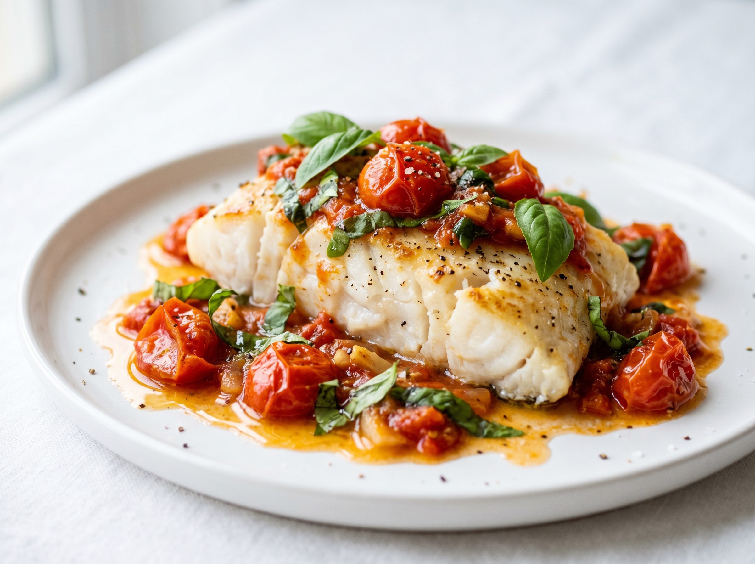 Gebakken kabeljauw met tomaten-basilicumsaus