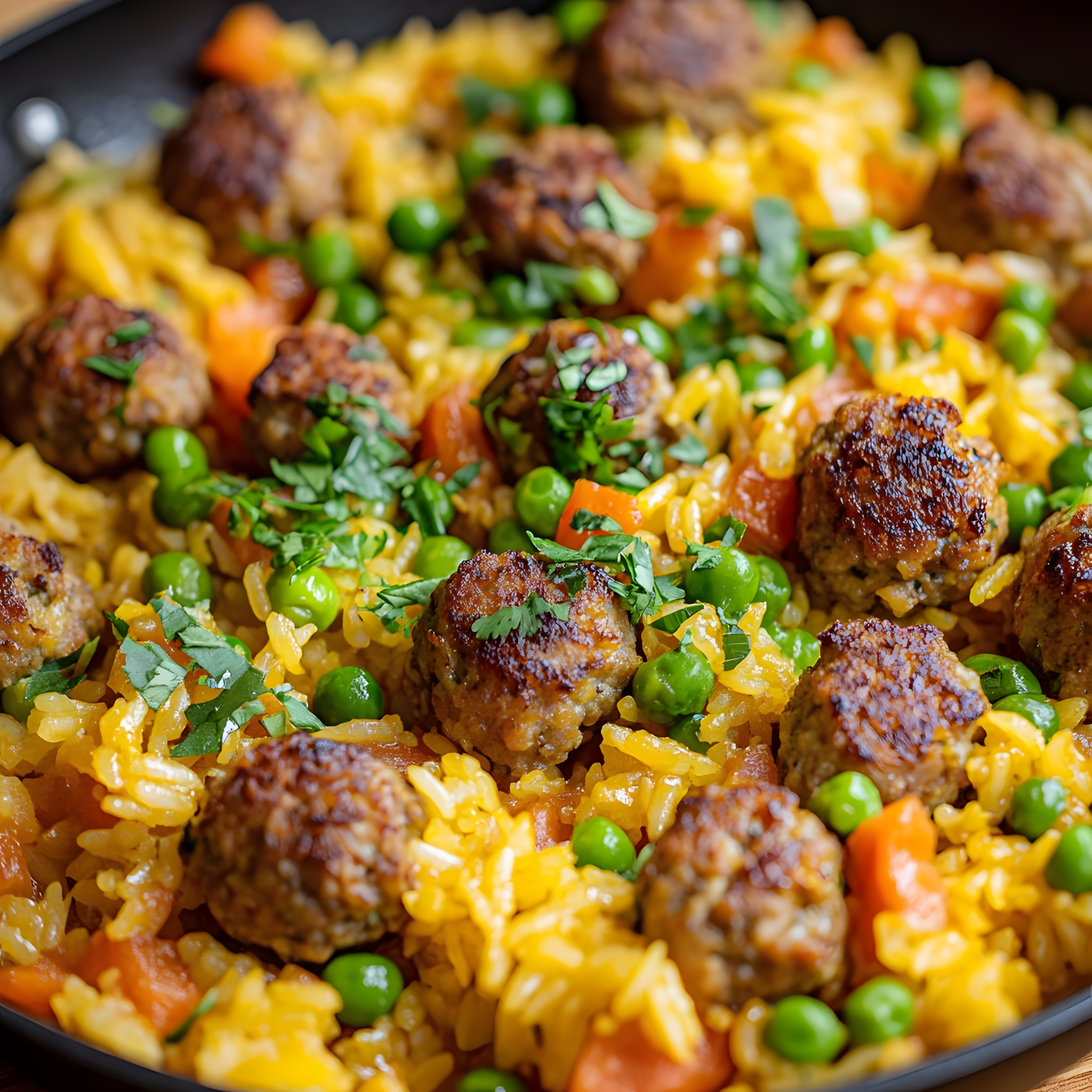 Gouden Rijstpan met Gehaktballetjes en Kleurrijke Groenten