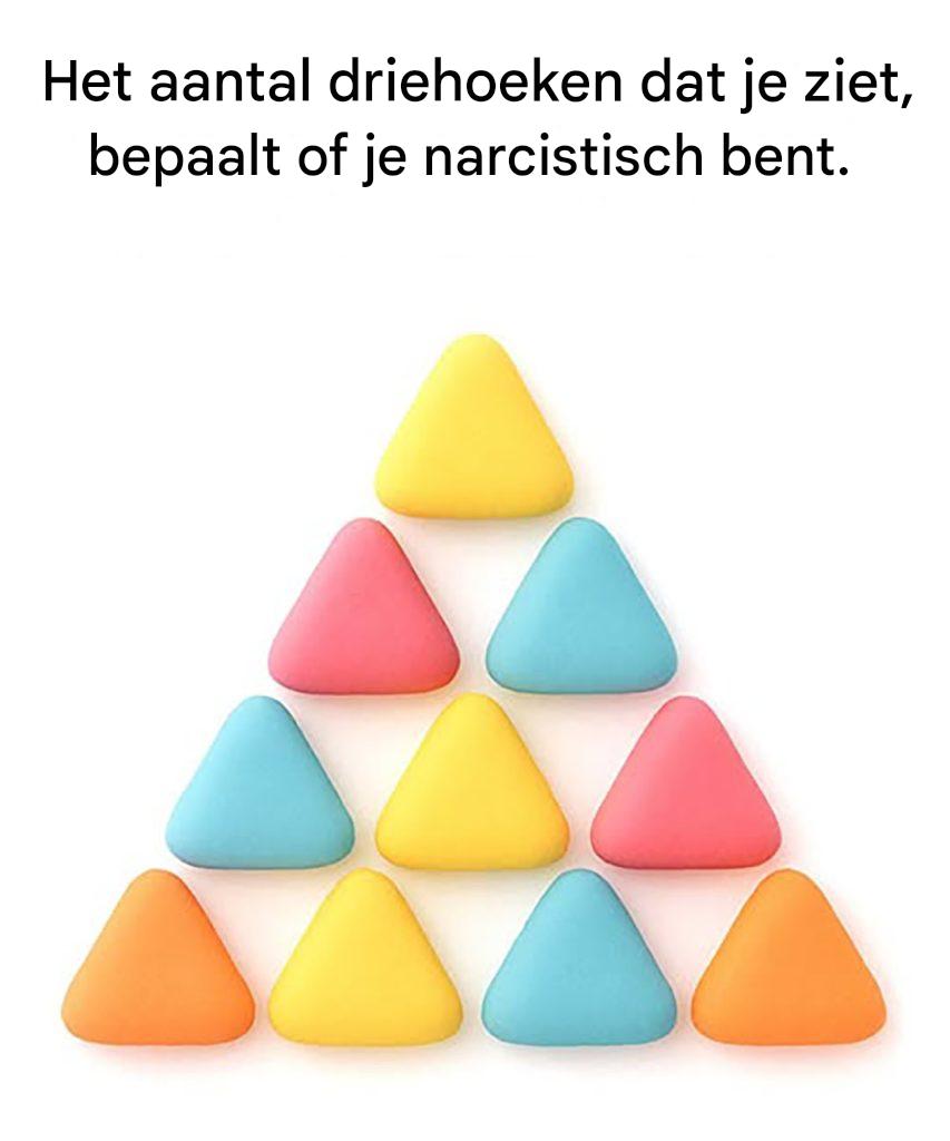 Op het eerste gezicht lijkt de afbeelding onschuldig: een paar gekleurde driehoeken opgestapeld als een geometrische puzzel voor kinderen. Maar als je er beter naar kijkt, vervaagt de eenvoud. Sommigen tellen er 9, anderen 13, en weer anderen meer dan 20. Wat als deze visuele puzzel niet alleen een kwestie van wiskunde was… maar ook van psychologie?