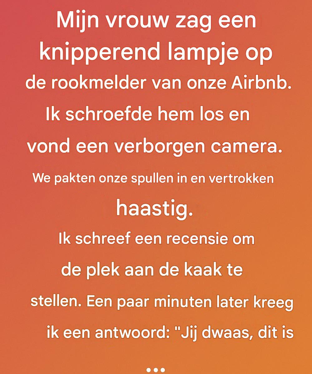 In eerste instantie dachten we dat het gewoon een waarschuwing voor een bijna lege batterij was. Maar er was iets vreemds aan. Misschien was het het patroon, of misschien was het de stille onrust die ons al sinds onze aankomst in de Airbnb achtervolgde.