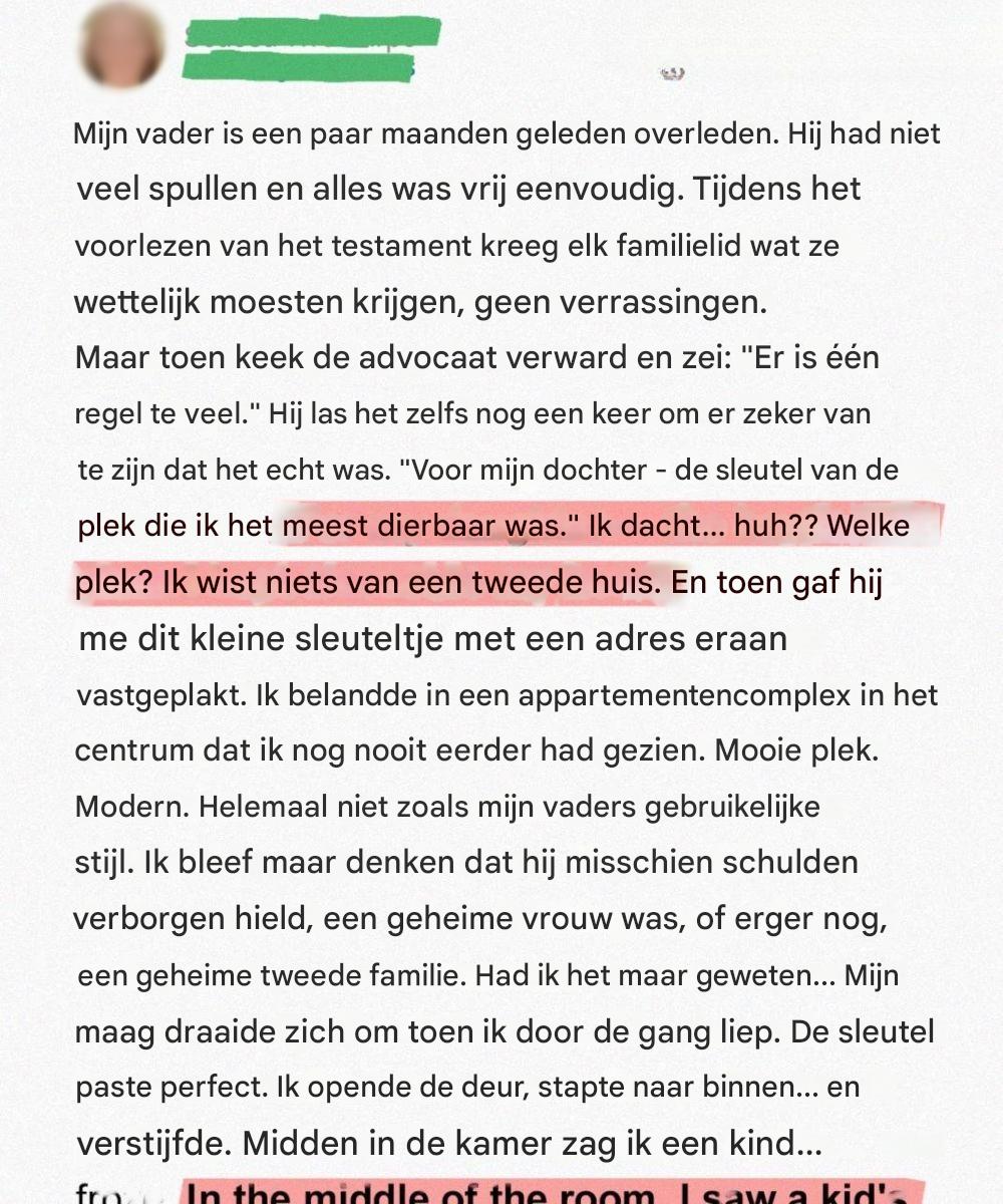 Toen mijn vader overleed, dacht ik dat ik alles over hem wist wat er te weten viel – een bescheiden man, rustig, standvastig, met weinig op zijn naam. Ik verwachtte dat zijn testament rechttoe rechtaan zou zijn. Een routine, zelfs. Maar toen zweeg de advocaat even, schraapte zijn keel en keek me aan. “Er is nog één ding,” zei hij.