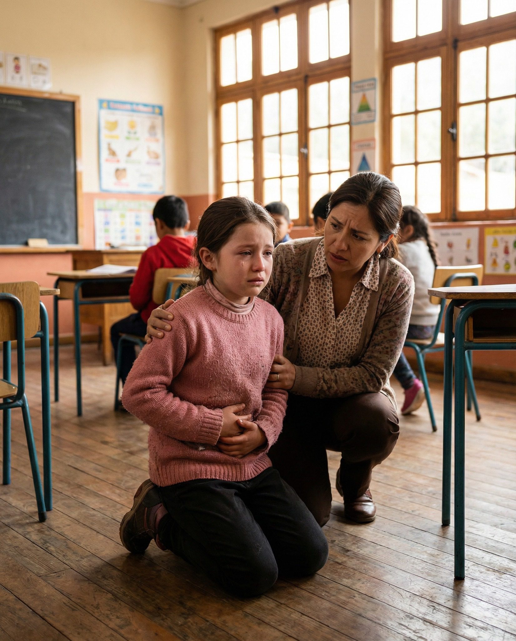 Het stemmetje was zo zacht dat Amelia Leighton bijna dacht dat ze het zich had ingebeeld. Ze draaide zich om en zag de tienjarige Nora Jensen de zoom van haar vest vastgrijpen. De ogen van het kind waren wijd open, haar lippen trilden alsof elk woord pijn deed. Het ochtendzonlicht viel op de vloer van het klaslokaal en verlichtte de vage blauwe plekken onder de boord van haar trui.