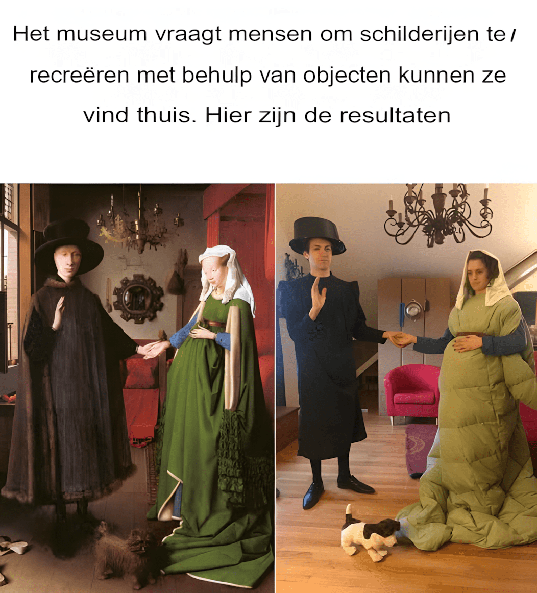 Ook al zaten de meesten van ons tijdens de coronaquarantaine thuis en konden we niet naar buiten om kunst in musea te bewonderen, dat betekende niet dat het leven saai of verstoken van cultuur was. Het Getty Museum in Los Angeles daagt kunstliefhebbers uit om foto’s van zichzelf te posten waarop ze hun favoriete kunstwerken in de veiligheid van hun eigen huis namaken. Mensen reageerden met groot enthousiasme en plaatsten hun unieke artistieke interpretaties massaal op sociale media. Scroll naar beneden om de beste voorbeelden te zien!