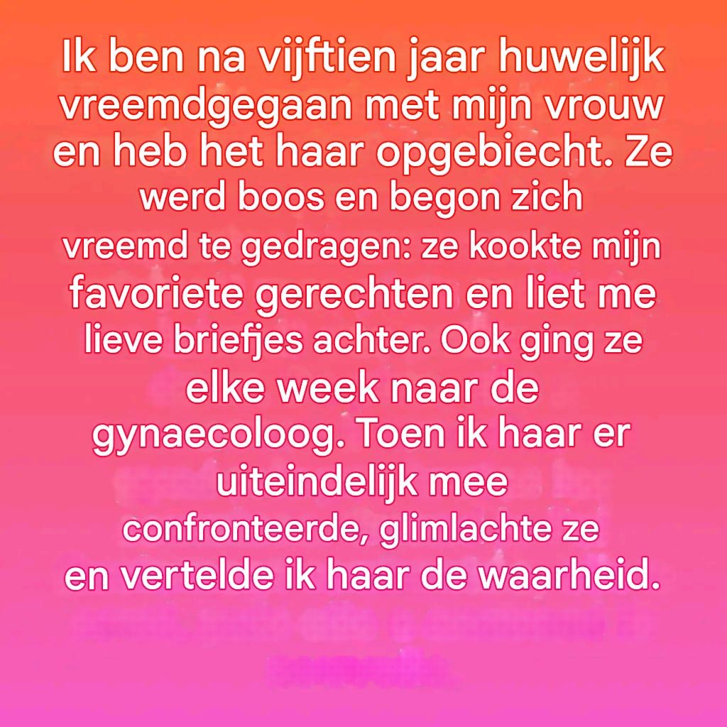 Na vijftien jaar huwelijk maakte ik een fout die ik nooit had gedacht te maken. Een fout die alles wat we hadden opgebouwd, verwoestte. Schuldgevoel overweldigde me nog voordat ik kon spreken: slapeloze nachten, gebrek aan eetlust, afgewende blikken. Elk moment met mijn vrouw herinnerde me aan de waarheid die ik probeerde te verdringen, uit angst haar onherstelbaar te kwetsen.