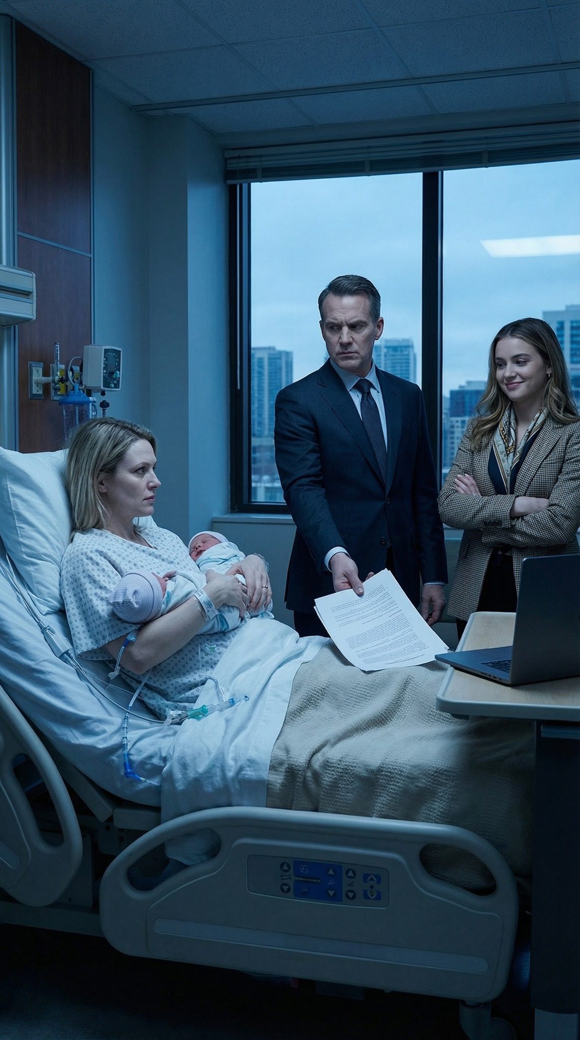 Precies om 7:02 uur vloog de ziekenhuisdeur open – niet met warmte, zelfs niet met nieuwsgierigheid, maar met irritatie en een gevoel van superioriteit. Adrian kwam binnenstormen, in een strak pak, met dure parfum op, zijn gepoetste schoenen tikten op de tegels alsof hij de eigenaar van de vloer was.